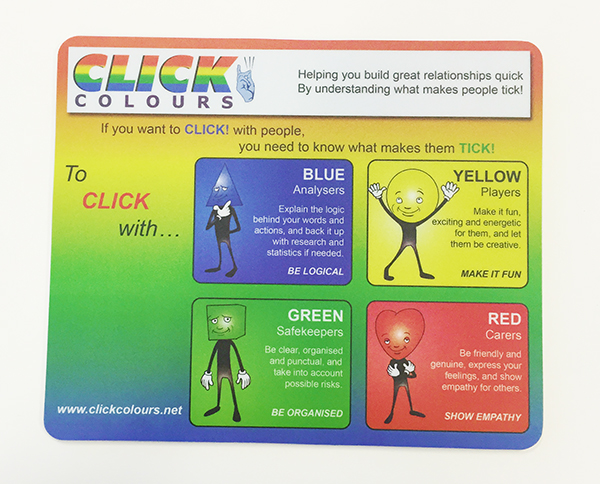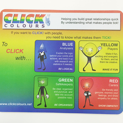 The Click! Colours Mouse Mats are a great way to embed the Click! Colours philosophy in your workplace. They serve as an everyday reminder that in order to build great relationships we need to understand what makes people tick and communicate with them accordingly.